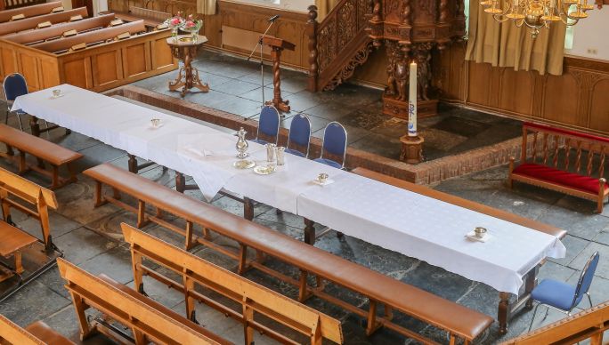 Vijf maal per jaar, waaronder op Goede Vrijdag, wordt in onze gemeente het Heilig avondmaal gevierd. Op de vrijdagavond, voorafgaand aan de avondmaalszondag wordt in wooncentrum De Schans eveneens het Heilig avondmaal gevierd. In geval van ernstige ziekte is het tevens mogelijk om huisavondmaal te vieren. Neemt u hiervoor contact op met de predikant of de ouderlingen.
