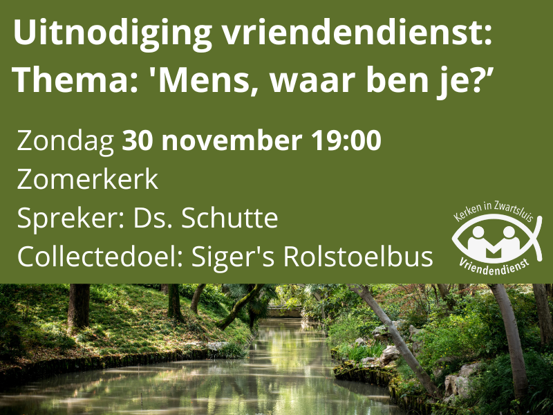Van harte welkom in de Vriendendienst op 30 november om 19.00 in de Zomerkerk, Zomerdijk 5, Zwartsluis. Neemt u, nemen jullie een vriend of vriendin mee naar deze vriendendienst?