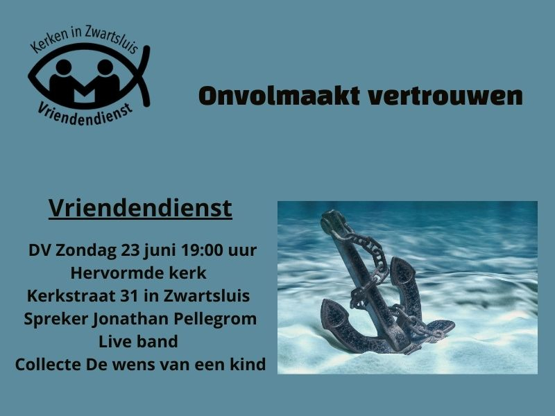 Van harte welkom in de Vriendendienst op 23 juni in de Hervormde kerk aan de Kerkstraat. We beginnen om 19.00 uur. Misschien ken je iemand die het spannend vind om naar de kerk te gaan, geeft hem of haar de hand en zeg: Kom, dan gaan we samen!