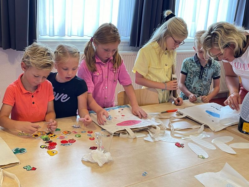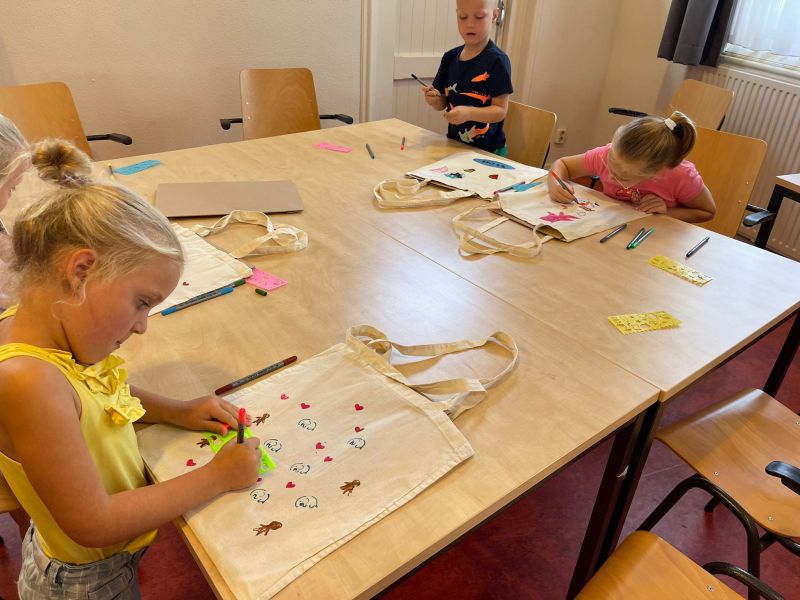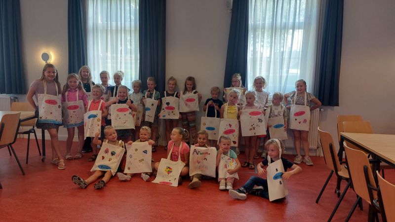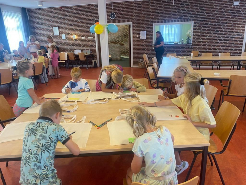 De activiteit was een canvas tas personaliseren. De kinderen, er waren er zo’n 23 hebben hun eigen tas gemaakt. Ze hebben er op mogen tekenen, sjablonen uitgezocht en erop gemaakt en hun eigen naam kwam er ook op. Er was nog wat tijd over en toen zijn er nog wat spelletjes gedaan zoals ballontrappen en stoelendans.