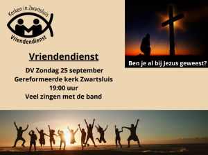 Heb jij al iemand op het oog? Nodig hem of haar dan maar snel uit en kom samen naar de Vriendendienst. Want een echte vriend brengt zijn of haar vrienden aan de voeten van Jezus.De Vriendendiensten zijn een initiatief van de gezamenlijke kerken in Zwartsluis.