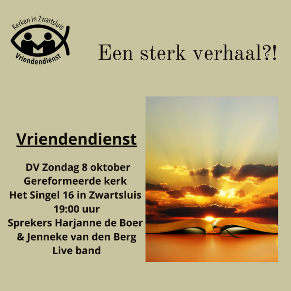 Van harte welkom in de Vriendendienst van 8 oktober om 19:00 in de Gereformeerde kerk in Zwartsluis en neem vooral een vriend of vriendin mee.